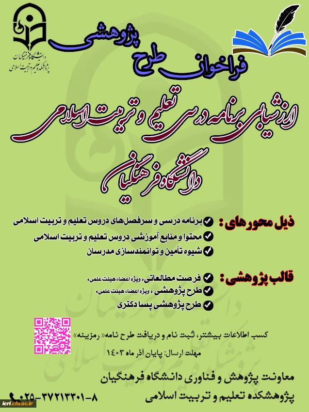 در فراخوان ارزشیابی برنامه درسی تعلیم و تربیت اسلامی دانشگاه فرهنگیان دعوت به همکاری می نماید.